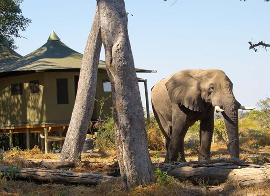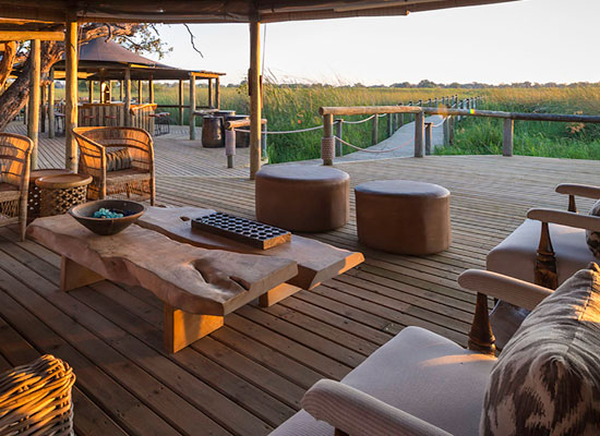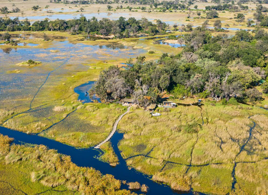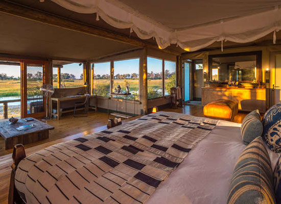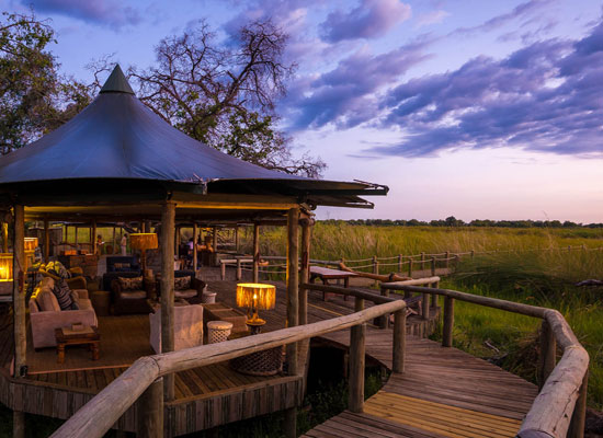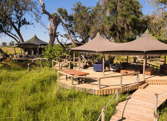 The Camp is a beautiful six-roomed tented camp shaded by the canopy of an ancient Okavango Delta forest. Each tent is large and roomy and has en-suite facilities. A plunge pool and reading area overlook the floodplains and a star deck leads off the dining area.