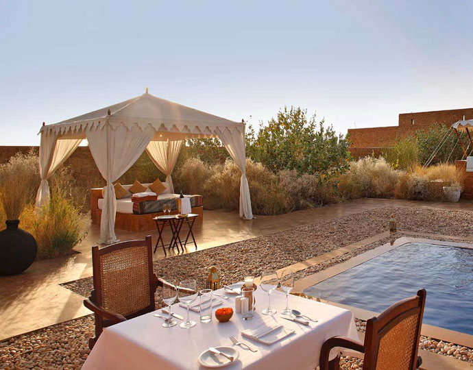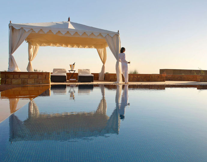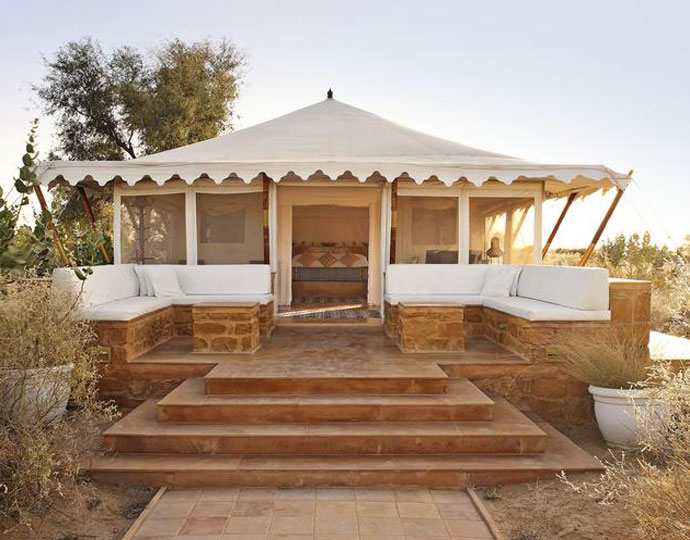 Established in 2008, this extraordinary desert camp is set on a one hundred acre private estate in the Thar Desert an hour from Jaisalmer. Inspiration was drawn from the royal Rajputana caravan sites and local craftsman carved sandstone walls, plunge pools and an inverted stepwell on which lies the inviting swimming pool. Evenings spent under the vast desert sky listening the haunting and ancient songs of the Manganiyar folk musicians will create memories that will last for ever. The camp evokes both the desert landscape and the spirit of Jaisalmer in its design. The vivid colours of Rajasthan are introduced on cushions, throws, and turbans. Sitting on sandstone plinths are 21 spacious tents, including 14 tented suites, 6 luxury suites and one Royal suite. The luxury suites have their own private walled gardens and sunken, heated plunge pools. The Royal suite is set in its own private walled enclosure and has dining and sitting tents, its own Spa and a private heated swimming pool. A personal butler will cater to your every need. All the tents have been stylishly decorated and furnished by Anjali Singh and it is in the detail that these tents stand out. Picnic hampers with water and cold drinks, butler’s bells beside your bed, writing desks and clay laundry baskets all add to the feeling of modern and ancient blending together perfectly. The wonderful staff combine privacy and attention seamlessly.